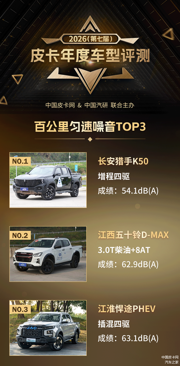 在静音榜单中,新能源皮卡同样表现突出。长安猎手K50以 54.1分贝的优异成绩夺得噪声控制冠军,电动驱动在静音方面的优势显而易见;江西五十铃3.0T D-MAX是唯一上榜的燃油皮卡,以 62.9分贝稳居第二;紧随其后的是插混皮卡江淮悍途PHEV,百公里匀速行驶噪音控制在63分贝左右,显著优于行业平均水平。