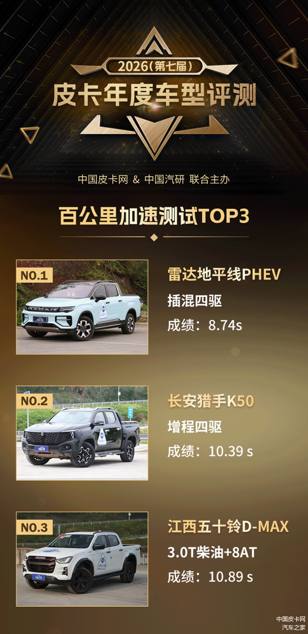活动自开展以来便受到了广大网友的持续关注,尤其是评测成绩成为关注核心。应大家期待,中国皮卡网将在近期揭晓多个测试维度的TOP 3榜单,上榜车型均为该项目中表现最为优秀的产品。昨天,我们已经发布了刹车制动与紧急避障两大项目的测评结果,今天,我们将聚焦动力响应与驾乘舒适性,正式公布百公里加速与百公里匀速车内噪声两项核心性能的成绩排名。