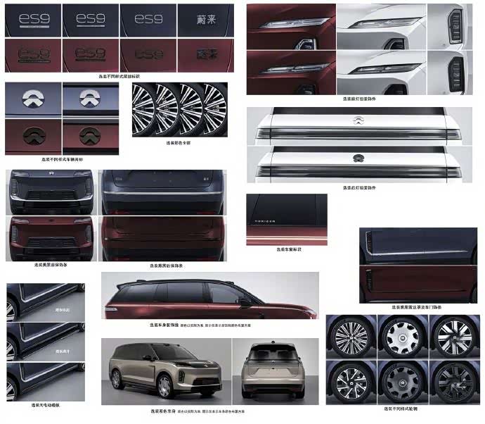 选装:申报信息显示ES9提供超过15种外观组件选装方案,包括双色车身、多种轮毂样式、彩色卡钳、熏黑外观套件等。车辆还可选装电动踏板、不同样式标识等,满足个性化需求。