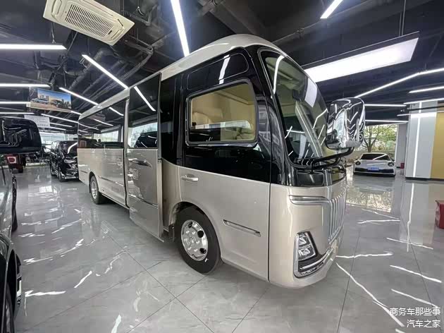 该车以“2+2+2+2+4”五排全顺向布局为核心,创新采用全隔断设计划分功能区域,实现私密性与实用性的完美平衡。隔断主体采用“双层钢化玻璃+金丝楠木样式桃木边框”,玻璃支持0%-100%无级调节透明度,雾化状态下打造专属私密空间,透明模式则保障座舱通透性,边框嵌入金色LED氛围灯,夜间点亮尽显奢华质感。隔断中部集成45英寸4K超高清电动升降电视,支持178°广视角观看,两侧配备雕刻祥云纹理的桃木喇叭罩与5.1声道高端音响,兼顾娱乐与商务展示需求。