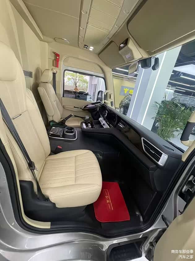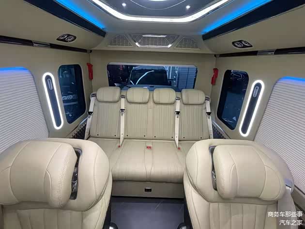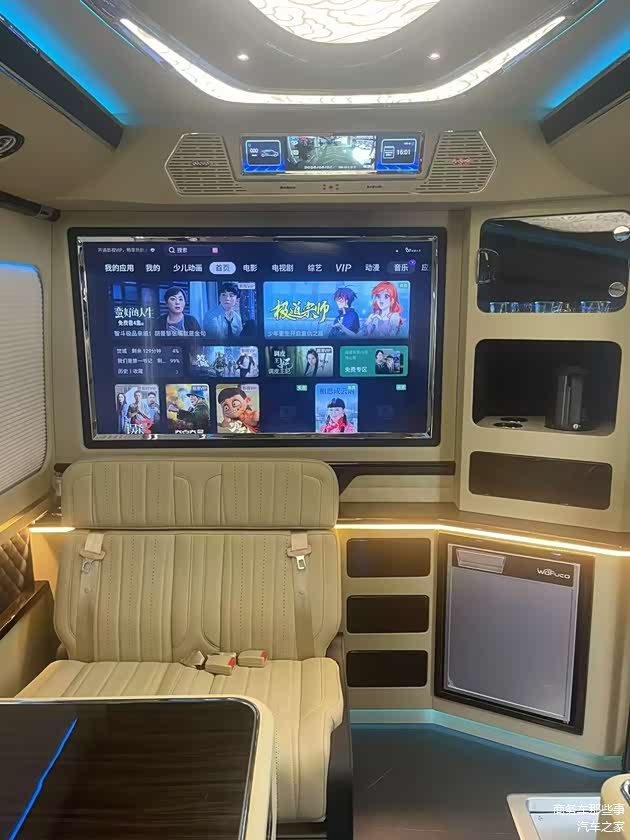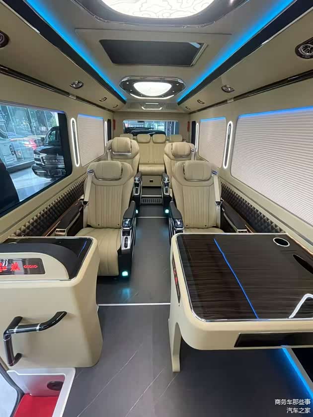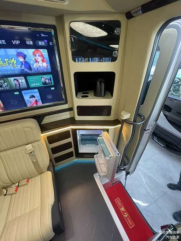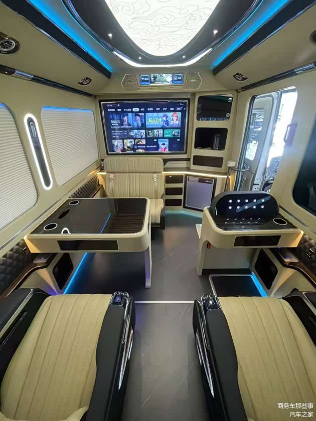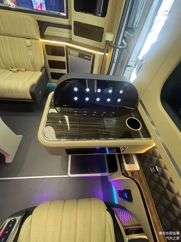 内饰改装深谙中式豪华美学,选用顶级NAPPA真皮座椅、意大利Alcantara翻毛皮车顶,搭配实木地板与桃木纹装饰板,驼色地毯注入温馨商务氛围,每一处细节都彰显质感。座椅配置堪称亮点,核心区域座椅配备可旋转头枕,支持上下28cm、前后20cm调节,完美贴合不同身高乘客的颈椎曲线,后排四联排座椅可180°放平平躺,兼顾乘坐与休憩需求。实用配置方面,隔断底部设有20L隐藏式储物格,座舱内遍布侧壁无线充电槽、220V电源接口、35L车载冰箱(支持冷冻/冷藏)与电加热水壶,满足商务办公与日常所需。顶部空客顶灯搭配多色氛围灯系统,配合双层隔音玻璃与空气净化器,营造出静谧、舒适、健康的座舱环境,让每一次出行都成为享受。