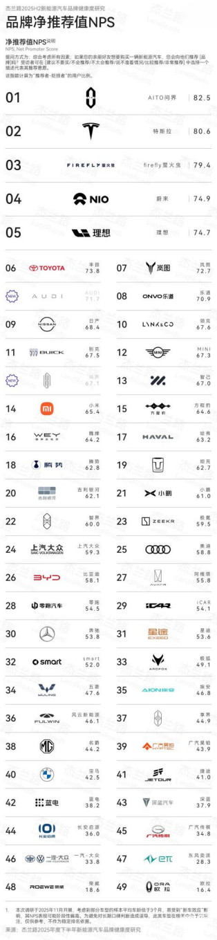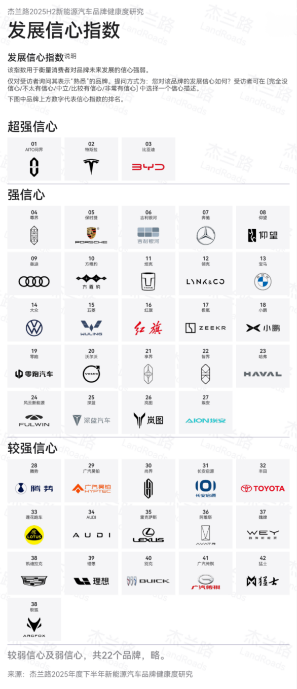在杰兰路发布的《2025年下半年新能源汽车品牌健康度研究报告》中,问界荣获品牌净推荐值、品牌发展信心指数、30万元以上品牌百人青睐指数三项第一,成为高端汽车里第一个、唯一一个连续三次获得品牌发展信心指数第一的品牌。