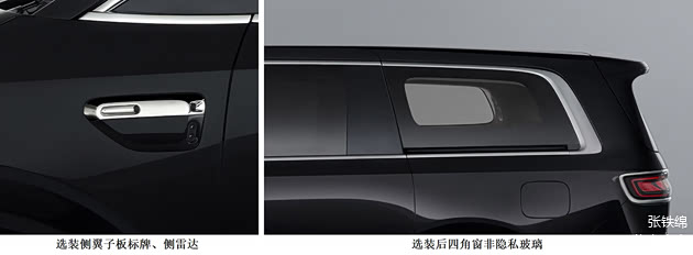 车身侧面造型舒展,车窗使用了全框式的镀铬压条装饰,后侧窗后部镀铬饰条加宽,侧滑门的隐藏式滑轨位于后侧窗底部。车门把手使用了传统外拉式,并且带有镀铬装饰,车身底部下包围上也使用了镀铬装饰。尺寸方面,新车的长宽高分别为5359/2009/1879mm,轴距3250mm。