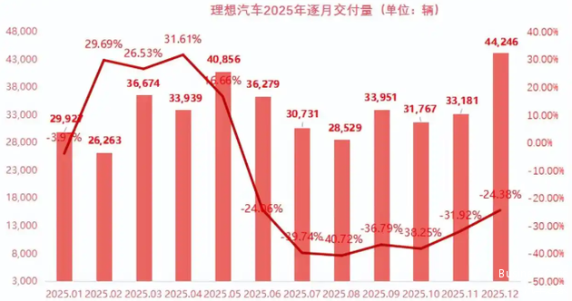 辛苦开发出来的一套冰箱彩电大沙发也成为了全行业致敬的对象。2025年,理想累计销量为40.63万辆,与2024年的50.05万辆相比锐减19%。理想也成了一众新势力里唯一一个销量同比下滑的车企。