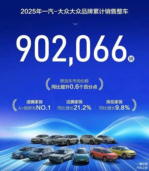 一汽-大众的2025年,整体市场表现呈现的是基盘稳固、增量强劲、生态完善的鲜明特征,用扎实的销量成绩筑牢其领先根基。从年度报告中,我们可以看到以下几大亮点。