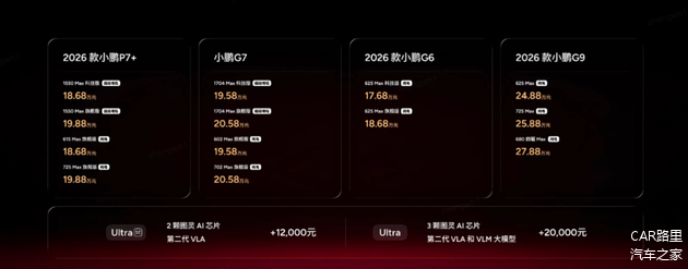 其中,2026款小鹏P7+纯电版与增程版同价,价格18.68-19.88万元;小鹏G7纯电版与增程版同价,价格19.58-20.58万元;同时2026款小鹏G9/G6迎来改款,整体价格17.68万元起。值得注意的是,据小鹏汽车CEO何小鹏透露:“今年小鹏还会推出4款全新的SUV,而且是面向全球的”。不难看出,2026年将是小鹏汽车的产品大年。