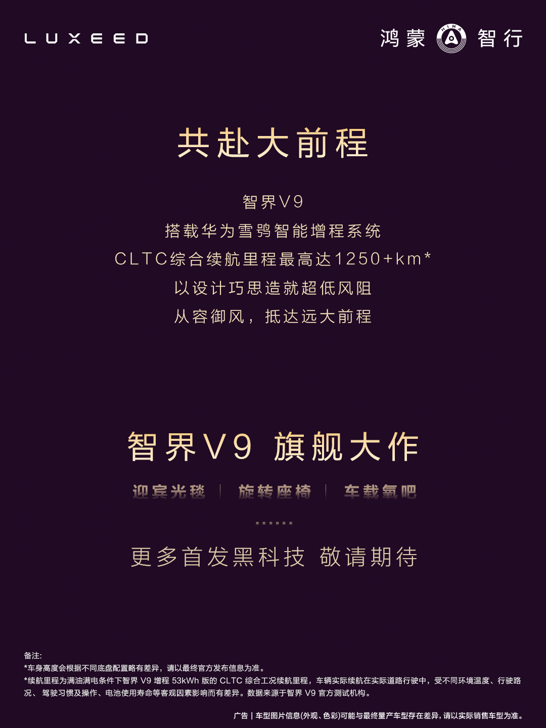 智界V9实车正式官宣了,目前知道的有以下亮点: 1、长宽高分别为5359*2009*1879mm,轴距3250mm 2、搭载华为雪鸮智能增程系统,配备53度电池和60L大油箱,CLTC综合续航里程最高可1250+km。 3、或将搭载全新一代华为乾崑智驾硬件、二排旋转座椅、最新鸿蒙座舱、动态迎宾光毯以及车载制氧机等黑科技。