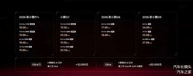 1月8日,小鹏汽车举办2026小鹏全球新品发布会,小鹏汽车正式发布了四款新车,包括2026 款小鹏 P7+、小鹏 G7 超级增程、2026 款小鹏 G6、2026 款小鹏 G9。其中2026款小鹏P7+ 为全球36国同步发布,新车有超级增程和纯电两种能源形式,超级增程有1550 Max 科技版和1550 Max 旗舰版,官方指导售价为18.68万元和19.88万元;纯电有615 Max旗舰版和725 Max 旗舰版,官方指导售价为18.68万元和19.88万元。2026款小鹏G7推出四个版本,超级增程1704 Max 科技版和1704 Max 旗舰版,官方指导售价为19.58万元和20.58万元;纯电602 Max 旗舰版和702 Max 旗舰版,官方指导售价为19.58万元和20.58万元。2026 款小鹏 G6推出纯电625 Max 科技版和625 Max 旗舰版,官方指导售价为17.68万元和18.68万元。2026 款小鹏 G9推出纯电625Max、725 Max和680 四驱Max版,官方指导售价为24.88万元、25.88万元和27.88万元。
