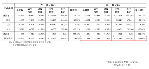 猫头鹰车志(ID:owlauto)讯,1月7日晚间,广汽集团发布2025年12月产销公告,数据显示,广汽集团2025年12月销量承压明显,当月汽车销量为18.75万辆,同比下降33.82%;产量为16.53万辆,同比下滑20.23%。广汽集团2025年全年产销均呈负增长态势,累计销量为172.15万辆,同比下降14.06%;累计产量为174.44万辆,同比下降8.98%。