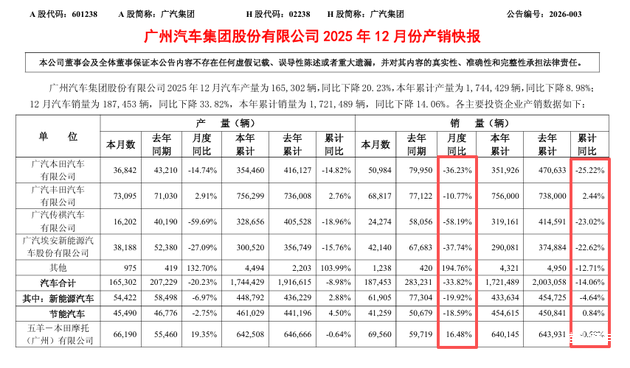 据猫头鹰车志了解,广汽集团自主品牌及新能源板块均面临较大压力。广汽埃安2025年全年销量为29.01万辆,同比下降22.62%;12月销量为4.21万辆,同比降幅达37.74%。广汽传祺全年销量为31.92万辆,同比下滑23.02%。广汽集团全年新能源汽车累计销量为43.36万辆,同比下降4.64%;12月单月新能源汽车销量为6.19万辆,同比减少19.92%,弱于整体市场表现。