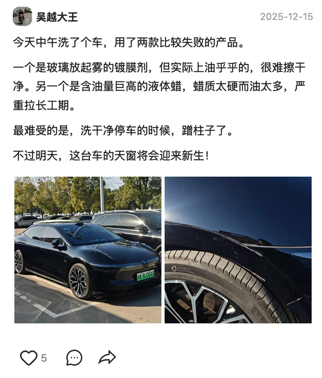 右前侧还有吴越大王的同款剐蹭(对,就是吴越大王前些天洗车却把自己的极氪007蹭了的故事)。这块伤痕我们划到了三星整备,交车前会重新把漆做好。至于吴越大王...应该只能当自费玩家了。
