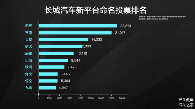 在围绕“归元”、“万里”、“辰星”、“烽火”、“太初”、“九鼎”等命名的投票中,“归元”以2.2万投票脱颖而出,成为长城汽车新平台的正式命名,也成为长城汽车迈向新台阶的精神注脚。