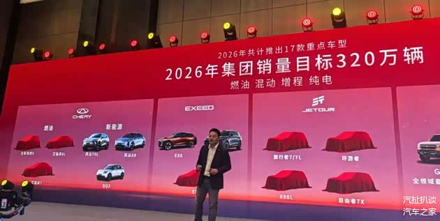 为实现这一跨越式增长,在1月8日举行的奇瑞家宴上,奇瑞官方也对外发布了2026年的新产品。“汽扯扒谈”从活动现场了解到,今年奇瑞旗下的五大品牌将至少17款全新或换代车型,全面覆盖燃油、混动、增程、纯电四大动力品类。这不仅是一次产品数量上的爆发,更是奇瑞“品牌向上”战略在2026年的集中落地。