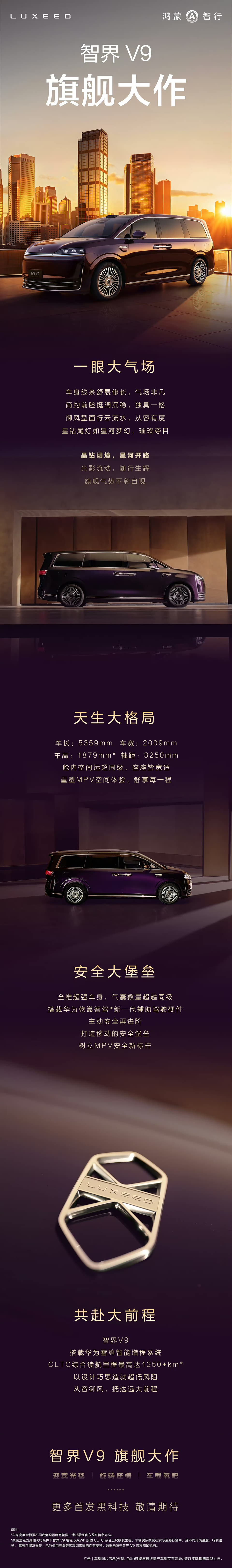 新车采用了当下鸿蒙智行的家族化的设计风格,包括像是简约前脸、水滴大灯、多辐式轮毂等。作为旗舰MPV,新车长宽高分别为5359mm/2009mm/1879mm,轴距为3250mm,体量相当不小,与此同时,官方表示智界V9有着数量超越同级的气囊,搭载华为乾崑智驾新一代辅助驾驶硬件,配备华为雪鸮智能增程系统,CLTC综合续航超1250km。另外像是什么迎宾光毯、旋转座椅、车载氧吧统统都是具备的。至于这台车最终会呈现出什么样的产品力,我们还是拭目以待一下吧!