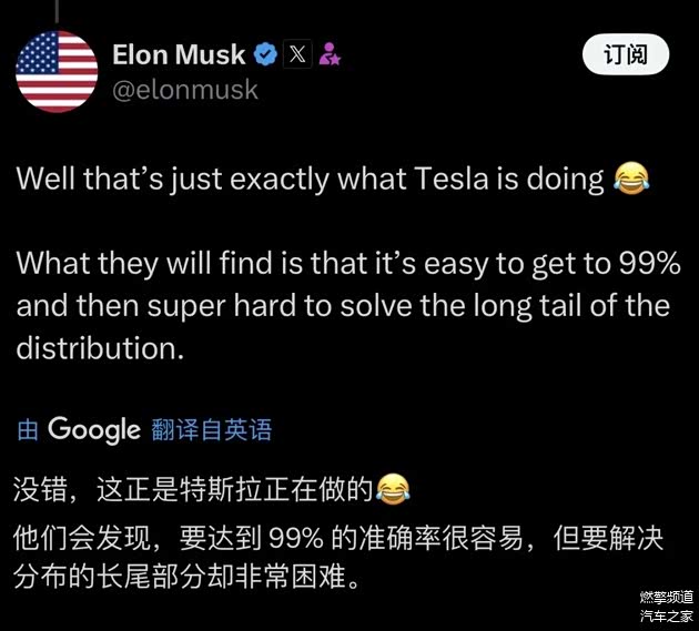 英伟达这次开源之后,马斯克暗戳戳地表示,英伟达在快速且轻松地将正确率提高到99%以后,将体会并见识到各种各样分布外的长尾难题。