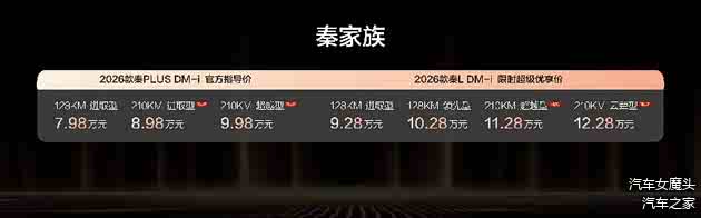 1月8日,比亚迪秦家族迎来重磅加推,2026款秦L DM-i/2026款秦PLUS DM-i 210KM长续航版双车同步上市,售价8.98-12.28万元。其中,2026款秦L DM-i 210KM长续航版限时超级优享价11.28-12.28万元,2026款秦PLUS DM-i 210KM长续航版售价8.98-9.98万元。同时,两款车型均带来了丰厚的上市权益礼。