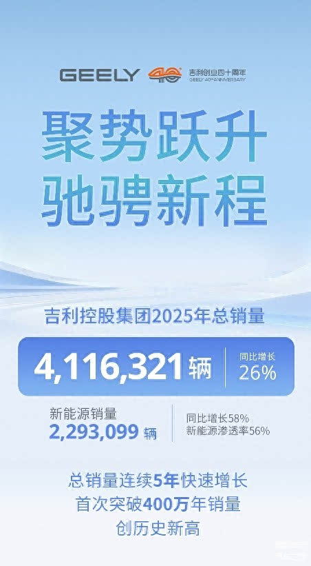 2025年,吉利控股集团全球总销量4,116,321辆,同比增长26%,实现连续五年快速增长,年销首次突破400万大关,创历史新高;其中新能源销量2,293,099辆,同比增长58%,新能源渗透率56%,成为集团市场增长的主要驱动力,在全球车企中处于领先地位。