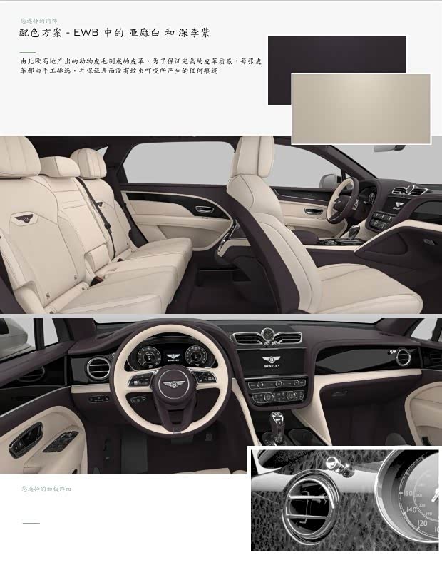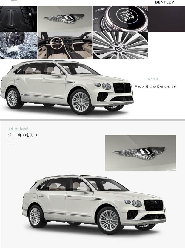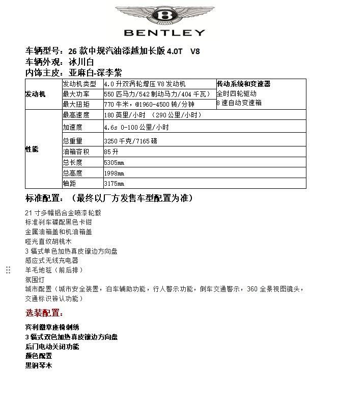 标配:LED矩阵式前大灯 运动踏板 信号灯识别 金属油箱盖 旅行配置 舒适座椅 厚绒毛地毯衬垫 开门警示 自动折叠后视镜 12.3英寸高清显示屏 盲点辅助 宾利旋转显示屏 Mulliner 动态迎宾灯 夜视功能 紧急求援服务 氛围灯套件 抬头显示 前后排无线充电器 后排触屏遥控系统 标配安全系统 负离子空气净化器 Muliner 车型 3色钥匙盒 自适应刹车灯 停车间距控制系统 自正式轮载盖 反衬色滚边地毯 全尺寸中央扶手(4座配置) 福式双色加热真皮镶边方向盘 木饰小桌板同双色面板上部颜色 滑盖全景天窗,含遮光板和化妆镜 Apple Carplay(带自正式轮毂盖)单色面板-Mulliner字标装饰的贵族黑前面板 22英寸Mulliner 喷漆抛光边轮毂