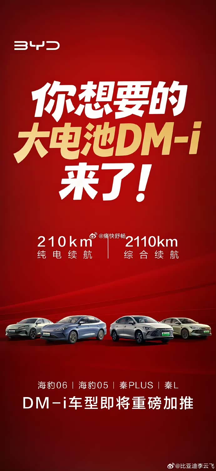 2026年1月7日,比亚迪官宣为秦PLUS DMi、秦L DM-i、海豹05 DMi及海豹06 DM-i 4款热销车型加推长续航版本,以“插混电力再加码”之势填补市场空白。 当前新能源市场中,10万级混动车型纯电续航多在80-120km,200km以上续航车型普遍价格超20万,且2026年国家插混新规提高续航门槛,消费者对长续航亲民款需求迫切。 这次比亚迪加推车型CLTC纯电续航突破210km,较同级翻倍,配合超2110km综合续航与20分钟快充(30%-80%),实现“一周一充”通勤与长途无忧。 新车依托第五代DM技术进化,搭载插混专用功率型刀片电池,能量密度提升31.6%! 叠加AI能耗管理系统,在不改变整车性能与重量的前提下达成续航飞跃。其价格维持10万级,与现有版本并行销售,重塑该价位价值标准。 作为全球插混销量冠军(累销超786万辆),比亚迪以技术前瞻性率先响应市场与政策需求,不仅进一步冲击燃油车市场,更以“好技术、好产品”的理念,引领全球插混技术迈向主流化发展。 #你想要的大电池DMi来了#