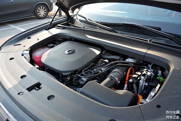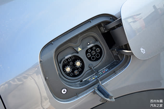 新车的前脸造型厚重而充满力量感,贯穿式的前大灯上排布了多个胶囊型日行灯设计,牌照框周围的银色护板与黑色包围则让这款中型SUV看上去更加大气,而新车的前后银色护板也是混动版与纯电版外观最大区别。