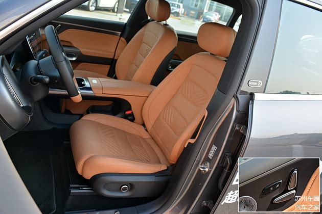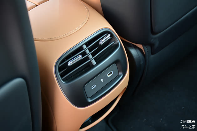 座椅部分,本次实拍车型座椅采用了全皮革包裹,前后排座椅均配备了包括腰托在内的多向电动调节。其中,前排座椅还配备有通风、加热以及按摩功能,后排两侧座位也配备了加热功能。