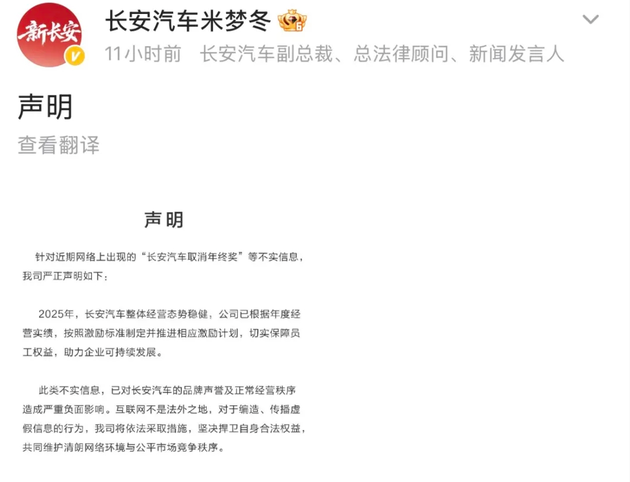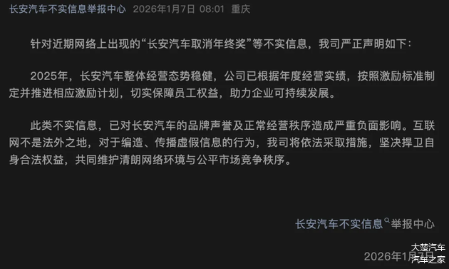 故事的开端充满戏剧性。1月初,一张疑似内部通知的截图在脉脉、小红书等平台疯传,内容直指“因2025年销量、利润率未达标,取消年终激励奖”。有网友精准对号入座:长安汽车2025年销量291.3万辆,完成率97.1%,恰好契合“接近目标未达标”的描述,“长安取消年终奖”的消息瞬间引爆热搜。