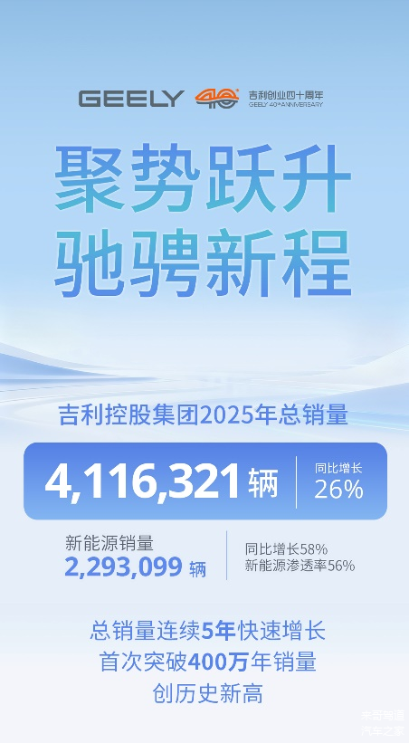 2025年,吉利控股集团全球销量达到411.6万辆,同比增长26%,这是一个凭借体系扩张堆出来的亮眼数字。更关键的是,新能源贡献了其中的229.3万辆,占比过半,成为推动规模继续向上的核心变量。