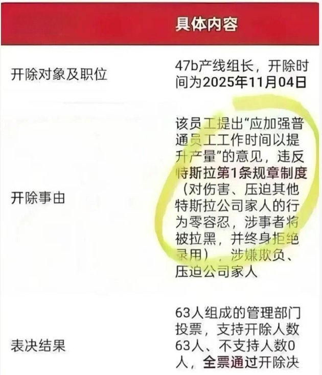 特斯拉,最近因为开除了一个产线组长而引起热议。不是因为他工作不努力,而是因为他太努力了,甚至提议让手下员工多加班来冲产能,结果直接被开除了。63个管理人员投票表决他的去留,63人同意,0人反对。