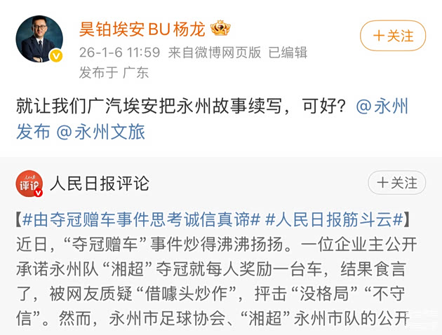 正是在这个微妙的时刻,广汽埃安高管、昊铂埃安BU销售服务副总裁杨龙转发了转发人民日报评论,并在个人微博上写道:“就让我们广汽埃安把永州故事续写,可好?”