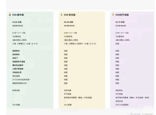 蔚来 ES9 的价格配置表疑似内部流出,豪享版 50.08 万、签名版 60.08 万、地平线版 65.78 万(BaaS 方案分别低 10 万左右),这波 “市场测试” 直接让网友吵翻:“50 万的豪享版性价比拉满”“签名版加 10 万换天顶盒太值”“地平线版的配置才是真旗舰”。咱们拆解下这三个版本,看看哪款最戳需求。
