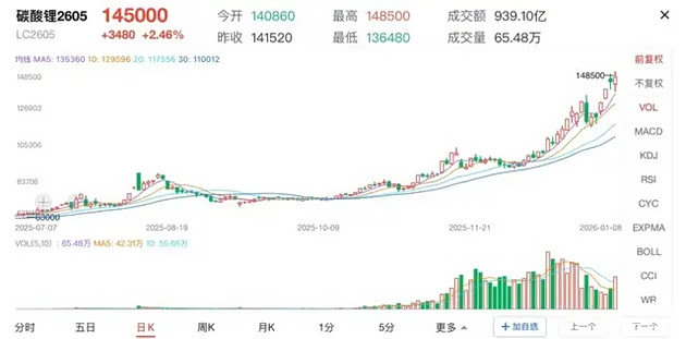 核心电池材料碳酸锂,价格已呈脱缰之势。广州期货交易所数据显示,从2025年12月初到2026年1月7日,碳酸锂主力期货价格从9万元/吨附近直线拉升至14.5万元/吨,一个月涨幅超过50%。