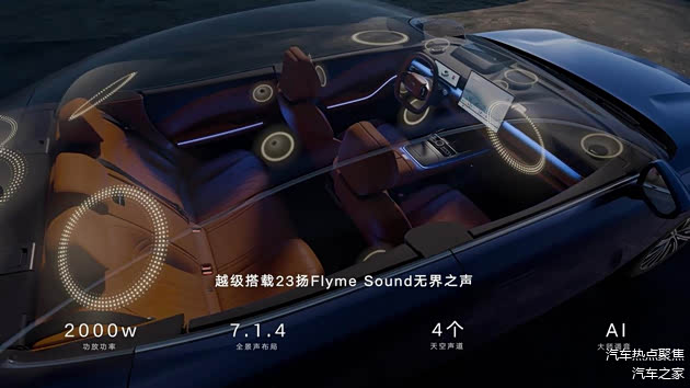 音频系统是星耀8座舱的亮点之一。其搭载的23扬声器Flyme Sound无界之声系统,并非简单的数量堆砌,而是基于科学的7.1.4全景声布局精心构建。该系统包含7个环绕声道、1个重低音声道及4个天空声道,配合2000W大功率独立功放,能够精准还原声音的方位与层次。四个天空声道的加入,首次在车内实现了三维立体声场,让声音从水平环绕升至全景包裹,无论是古典乐的细微颤音还是电影原声的澎湃动态,都能得到极具临场感的呈现。