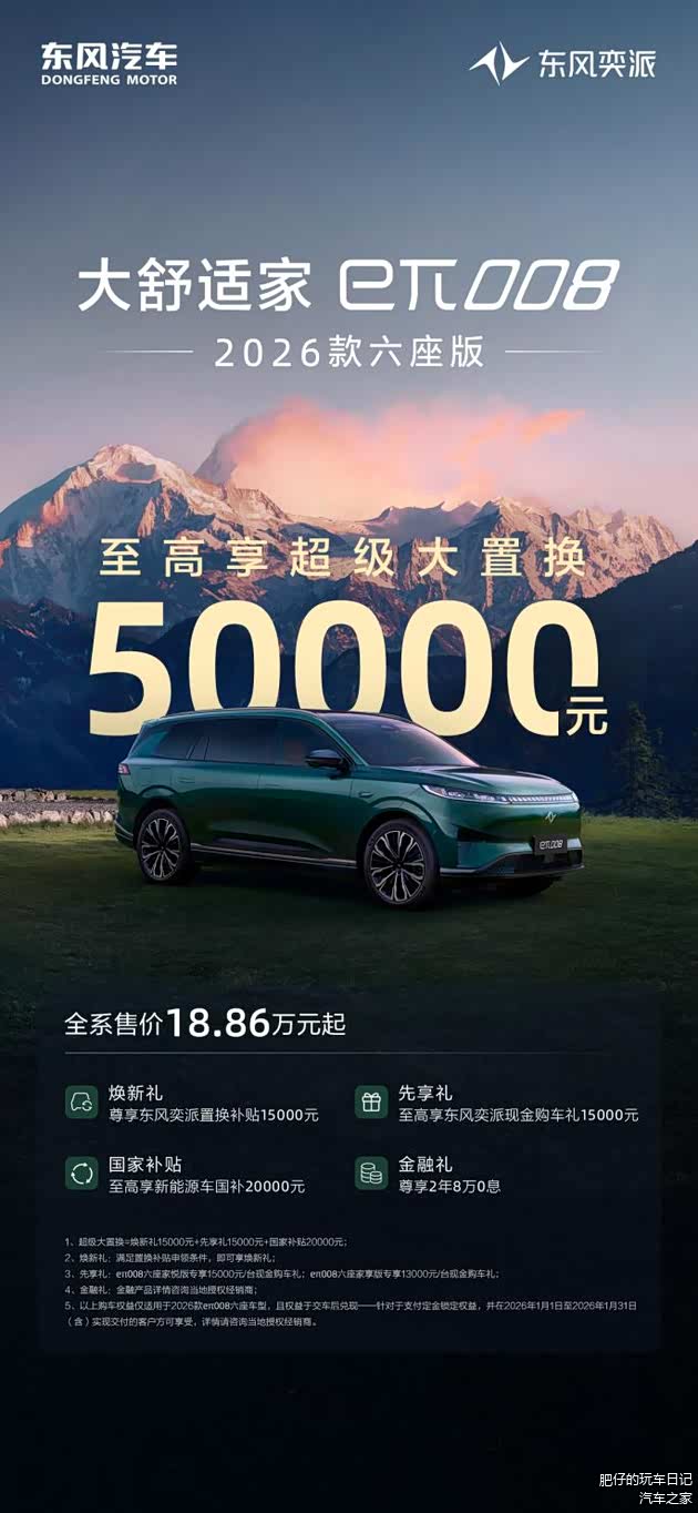 新年启新程,好礼伴你行。作为央企新能源品牌,东风奕派旗下主力车型在各自细分市场均展现出强劲竞争力。2026年开局之际,品牌推出的购车福利覆盖旗下全部主力车型,从购车补贴到金融支持,再到用车保障,全方位满足不同用户群体的购车需求。未来,东风奕派将继续坚守安全、驾控、智能、品质四大技术护城河,以更丰富的产品矩阵、更贴心的服务与更实在的福利,带着对科技的热忱与对用户的赤诚,与用户共赴更加精彩的未来。