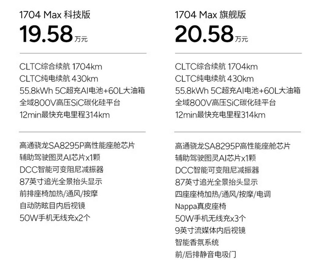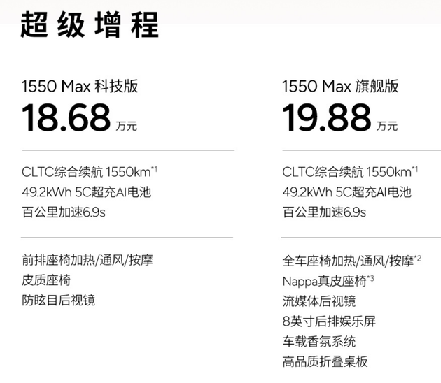 小鹏G7的情况同样如此,增程版与纯电版起步价均为19.58万元,但增程版减配了全车电吸合车门、流媒体后视镜、后排手机无线充电、真皮座椅、二排座椅电动调节、二排座椅加热/通风/按摩、车载香氛系统等。