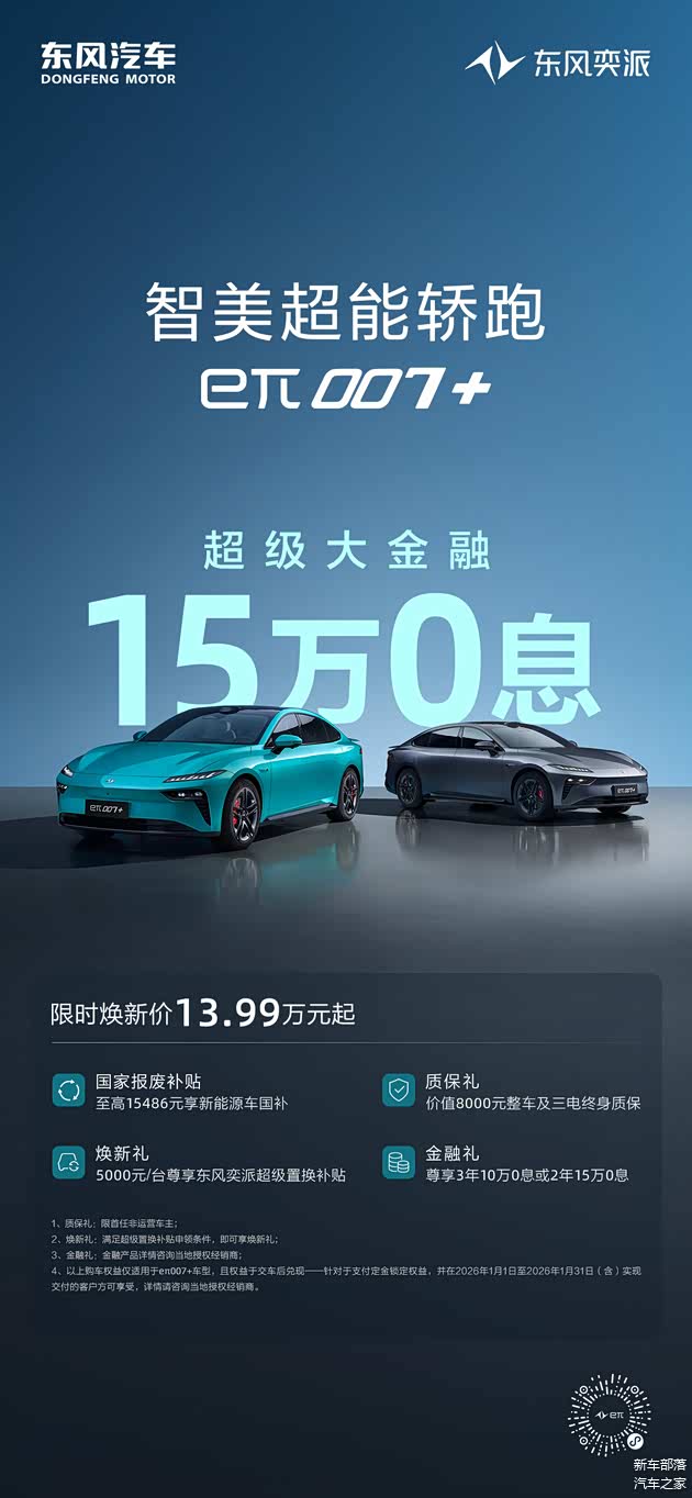 进入2026年,这款智美超能轿跑再次加码诚意,限时焕新价仅13.99万元起,并同步释放“15万0息”的重磅金融礼,以越级产品力与超值权益,持续领跑14万级新能源轿跑市场。目前,eπ007+不仅提供价值8,000元的整车及三电系统终身质保服务,免除长期用车后顾之忧;还针对置换用户推出高达5,000元的超级置换补贴,并可享至高15,486元的国家报废补贴,助力用户以更低的落地价格喜提新车。为切实降低用户的购车门槛,东风奕派还提供了“10万元3年0息”或“15万元2年0息”的灵活金融方案,大幅缓解一次性资金压力。