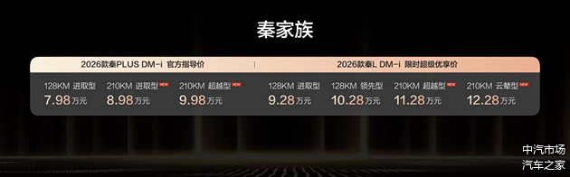 1月8日,比亚迪秦家族迎来重磅加推,2026款秦L DM-i /2026款秦PLUS DM-i 210KM长续航版双车同步上市,售价8.98万~12.28万元。其中,2026款秦L DM-i 210KM长续航版限时超级优享价11.28万~12.28万元,2026款秦PLUS DM-i 210KM长续航版售价8.98万~9.98万元。同时,两款车型均带来了丰厚的上市权益礼。