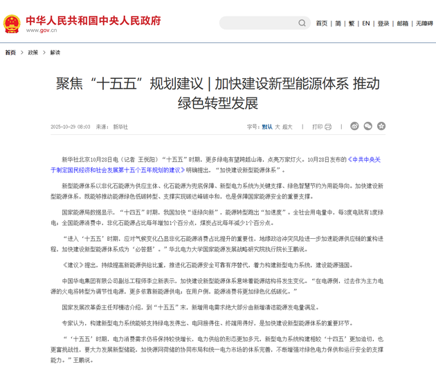 “十五五”规划建议中明确提出“加快建设新型新能源体系”