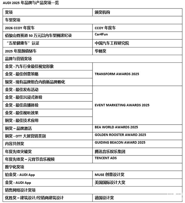 同时,销售与服务网络将持续扩容,为用户提供专属豪华体验。宋斐明表示,品牌将深化本土承诺,携手合作伙伴带来更多融合奥迪精工与中国数字活力的产品,共塑豪华电动出行未来。 此外,2025年AUDI品牌还斩获多项重磅荣誉,涵盖车型、品牌营销、数字化、销售网络设计等多个领域,彰显全方位实力。