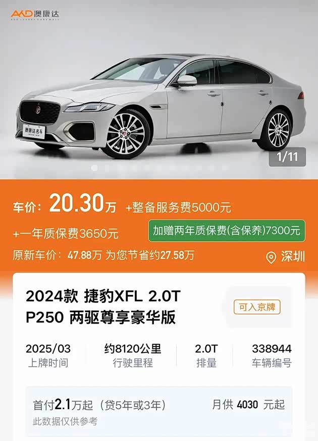 用B级车的钱,买一台车龄极新的豪华C级轿车?捷豹XFL让你梦想成真!澳康达二手车在售的这辆2024款 捷豹XFL 2.0T P250 两驱尊享豪华版,意味着它拥有捷豹最新颖的设计以及最前沿的车机系统,外观修长优雅,内饰豪华且科技感足,英伦气质独特,能让你轻松远离“街车”的庸俗。