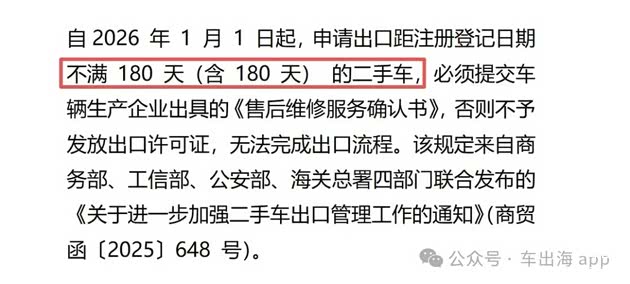 这是新规针对“零公里二手车”套利的核心管控措施!新规明确,自2026年1月1日起,凡是申请出口的车辆,距注册登记日期不满180天(含180天)的,必须补充提交车辆生产企业出具的《售后维修服务确认书》。注意了,这份确认书可不是随便找个机构就能开的——必须是列入工信部公告的汽车生产企业出具并加盖公章,旗下销售公司、海外经销商都没有资格,少了这张盖着车企公章的文件,商务部门直接不予发放出口许可证,海关环节更是直接卡住,前期的备货、谈单、订舱全白费,纯纯白忙活!