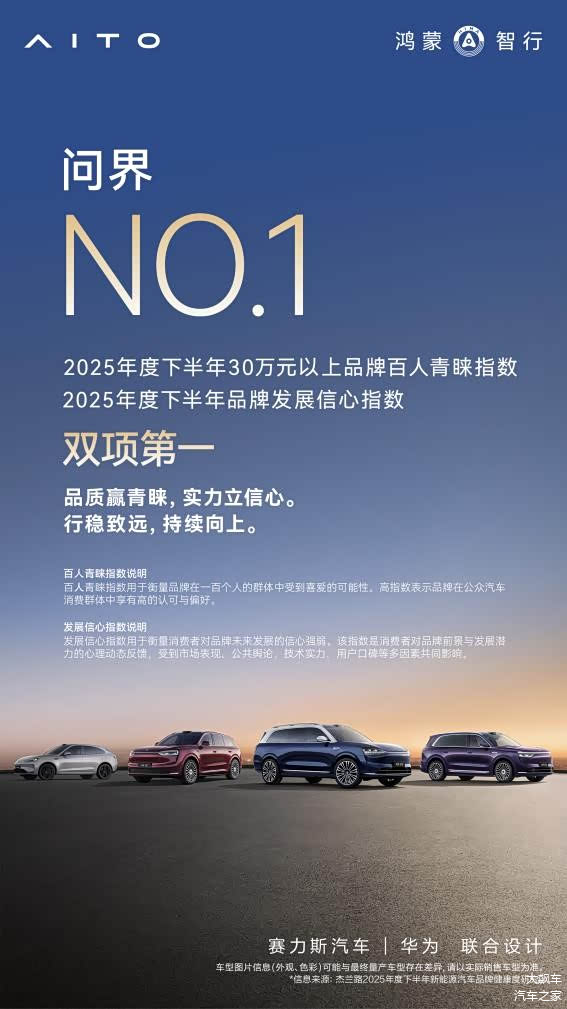 近日,杰兰路咨询发布《2025下半年新能源汽车品牌健康研究报告》。数据显示,问界在多项关键指标中位居前列,包括品牌净推荐值(NPS)、品牌发展信心指数及30万元以上品牌百人青睐指数均位列第一。