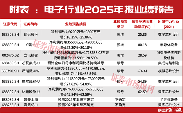 在人工智能快速发展的背景下,电子行业上市公司业绩表现保持稳健。据Wind统计,截至目前,电子行业共有9家上市公司发布了2025年度业绩预告,其中,以立讯精密为代表的制造龙头延续稳健增长,净利润规模预计在165亿元以上。而聚焦GPU、AI芯片、功率半导体的硬科技企业则多数实现业绩增长,出现亏损企业的减亏趋势也十分显著,彰显国产替代下的长期韧性。
