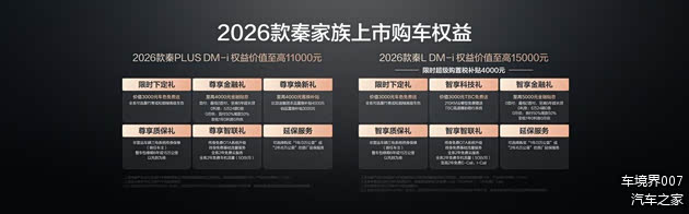 值得一提的是,2026款秦L DM-i 210KM长续航版为追求品质的家庭带来进阶之选,推出价值至高15000元的多重权益。在1月31日前下单,可以享受限时超级购置税补贴4000元;购买210KM云辇型,还可以免费获赠TBC高速爆胎稳行系统,让用户购车更省钱,出行更安全。