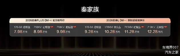 1月8日,比亚迪秦家族迎来重磅加推,2026款秦L DM-i /2026款秦PLUS DM-i 210KM长续航版双车同步上市,售价8.98-12.28万元。其中,2026款秦L DM-i 210KM长续航版限时超级优享价11.28-12.28万元,2026款秦PLUS DM-i 210KM长续航版售价8.98-9.98万元。同时,两款车型均带来了丰厚的上市权益礼。