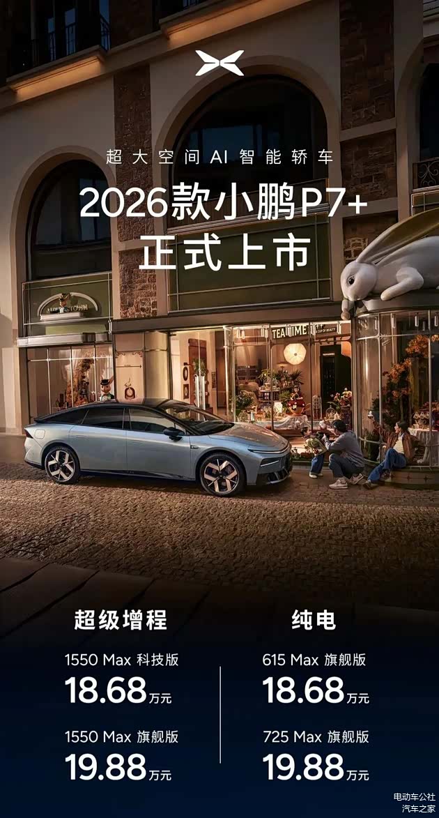 1月8日,新款小鹏P7+上市。新车推出纯电版、增程版共4款车型,售价18.68-19.88万元。