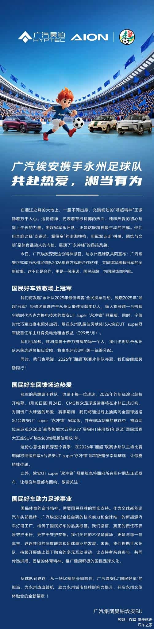 同时,在1月18日至24日于永州举办的CMG群众足球邀请赛期间,广汽埃安将通过线上抽奖向全国球迷送出1台埃安UT super“永冲锋”冠军版;并在现场观赛的球迷中,抽取两位幸运观众送出“豪华智能大五座SUV” 昊铂HT使用权1年,以及“国民增程大五座SUV”埃安i60增程版使用权1年。更让人期待的是,在2026年“湘超”联赛永州队主场比赛期间,广汽埃安将继续抽取6台埃安UT super赠予幸运球迷。这一系列动作,形成了贯穿赛季的品牌互动体系。