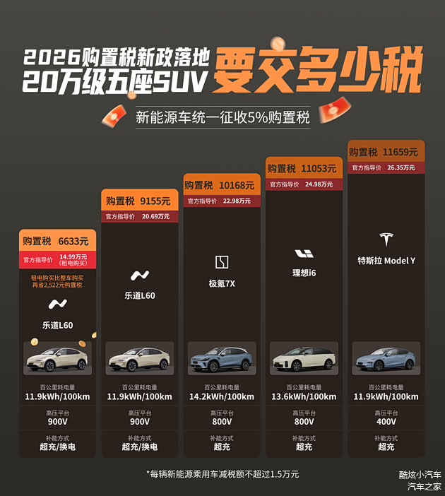 极氪7X:起售价22.98万,按照2026年新能源购置税新政,应缴购置税为10168元。作为极氪品牌的主力车型,这个价格正好卡在特斯拉Model Y与乐道L60中间。