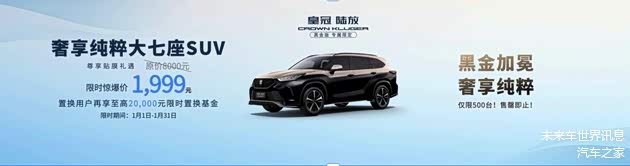 旗舰典范皇冠陆放,对追求高端品质的用户,特别推出黑金版尊享贴膜礼遇。价值8000元的原厂高品质隔热膜,限时专属秒杀价仅1999元,限量前500名订车用户,先到先得,奢华感受再次升级。同时,在1月1日到1月31日期间置换的用户,额外再享至高2万元限时置换基金。