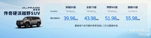 硬派传奇普拉多,作为硬派越野的标杆,其官方价格区间为44.98万-55.98万元。此次推出限时焕新价格,穿越BX版起步价打入40万以内,全系焕新价来到39.98万-55.98万区间;置换用户还可额外再享至高1.5万元补贴。