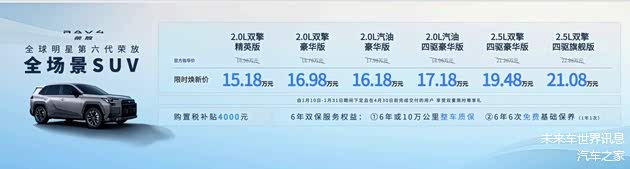 全能担当全新荣放,作为本次交付的主角,其官方价格区间为16.98万元-22.88万元,限时焕新价15.18万元-21.08万元。1月10号-1月31日期间下定且在4月30日前完成交付的用户,即可享受4000 元购置税补贴+ 6年双保服务权益,实惠满满,诚意十足。